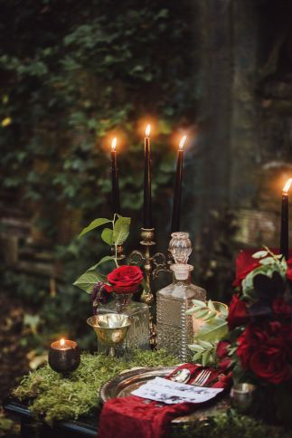 For those looking to make an impression! This is a simple tablescape that makes a huge impact and can be recreated in any setting. First, lay down a bed of fake moss. An assortment of red flowers will be the main centerpiece but a crystal decanter and other like objects would make great additions. Lastly, black candle sticks are a must.