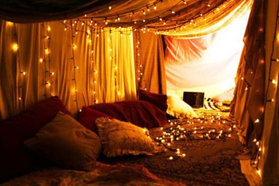 One of our favorites! Grab a bunch of sheets and blankets and build a fort! Hang string lights along the sheets to create a romantic glow. Then stuff in a bunch of pillows and order your favorite snacks and just embrace pillow talk.